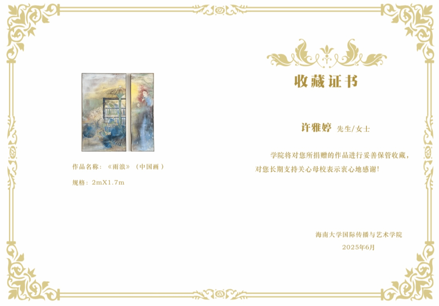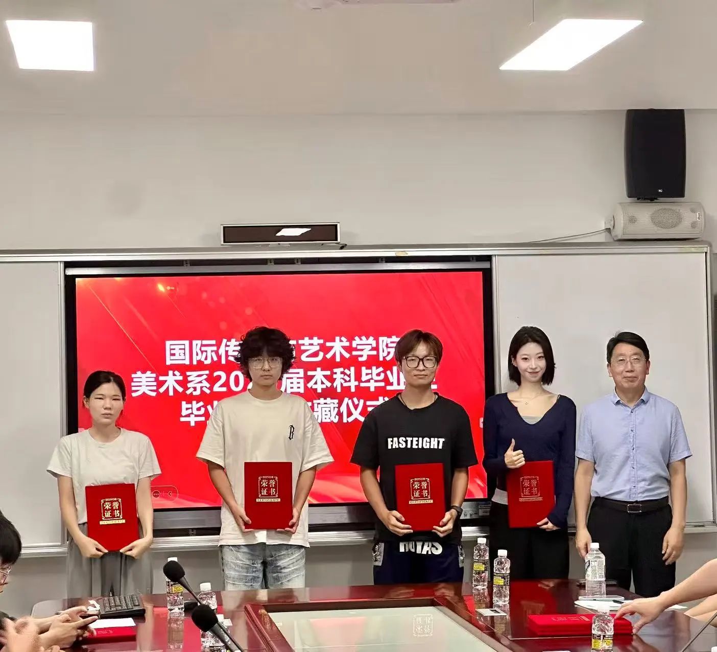 仪式上,郑立波经理对毕业生的艺术才华和努力表示高度赞赏,强调公司对美术教育的重视和对员工创作成果的认可。他对2025届毕业生的美好未来提出了殷切希望,并分享了自己的大学故事和生活。经理表示艺术是时代的镜像,是思想的凝练,更是同学们的精神灯塔。作品被公司收藏是同学们的荣耀,更是连接母校的情感纽带,为自己的一生种下美好记忆的种子。参加收藏仪式的同学代表表达了自己对公司、公司和老师的感激之情,表示自己的作品能被公司收藏感到非常荣幸,对自身具有很大的激励作用,感恩老师们的培养和指导。