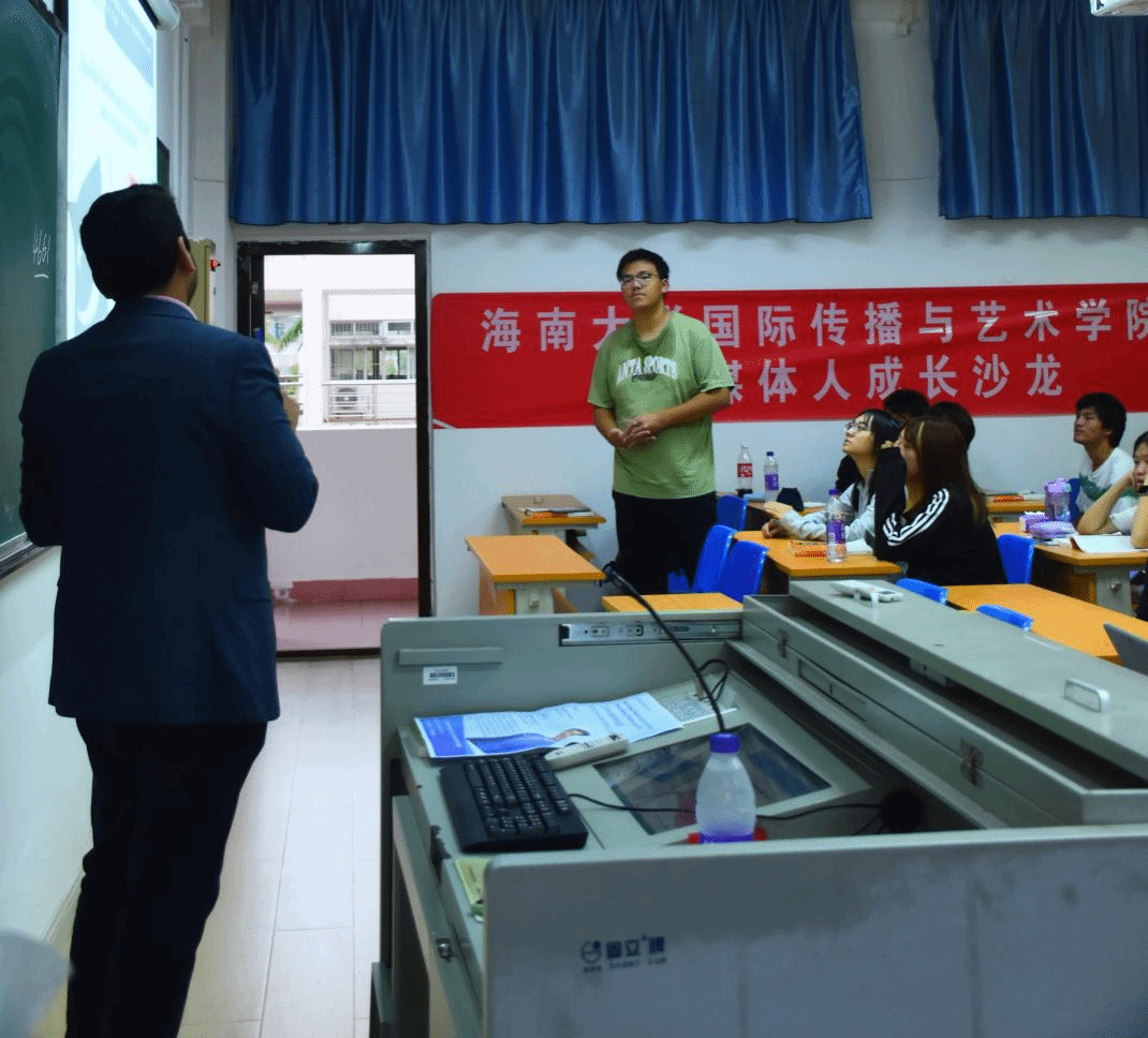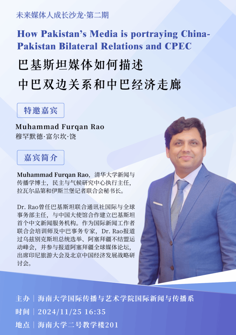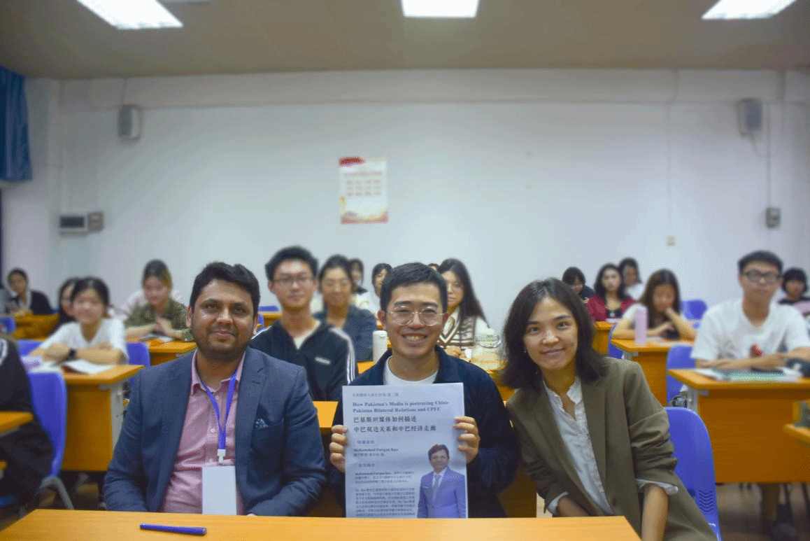 11月25日下午,太阳成集团tyc33455官方网站未来媒体人成长沙龙第二期在二号教学楼201教室举行,本次沙龙由清华大学新闻与传播学博士富尔坎·饶主讲“巴基斯坦媒体如何报道中巴双边关系和中巴经济走廊”,公司国际新闻与传播专业2024级全体员工参与讨论。富尔坎·饶的好友、巴基斯坦《黎明报》分社社长Bakhsh Behram一同参与了讲座。