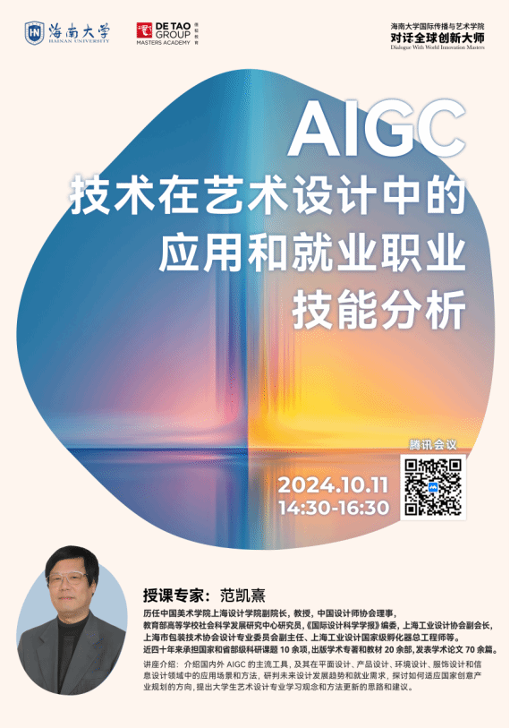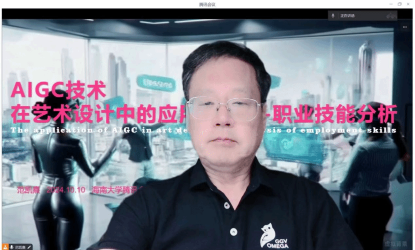 10月11日14:30,太阳成集团tyc33455官方网站2024“对话全球创新大师讲座”《AIGC技术在艺术设计中的应用和就业职业技能分析》在线上举行,由中国美术公司范凯熹教授主讲,设计系专业教师李珂博士担任学术主持,线上线下共100名左右师生同时参与。