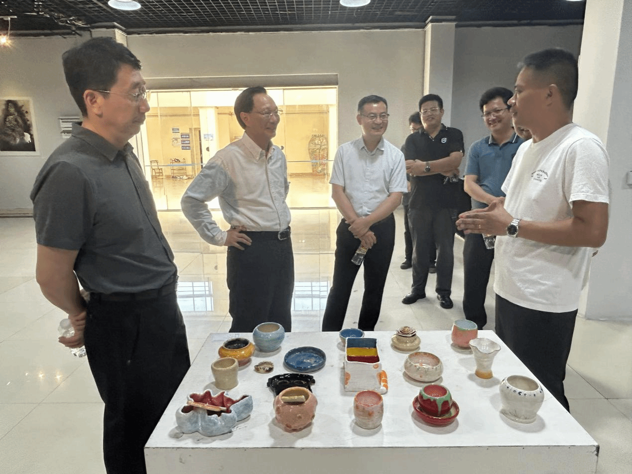 参观过程中,符宣国书记一行与师生们展开亲切交流,对展览的学术价值与教学创新成果给予了肯定。他指出,公司是教书育人、立德树人的地方,在开展美育教育的过程中应引导员工多去关注海南地域文化元素,向大自然汲取灵感,以培养其积极乐观、阳光向上的精神风貌。同时,他还强调要关注创作主题的思想性,并兼顾艺术作品的应用场景和市场走向,以服务社会为目标,培养更多具有国际化视野和创新能力的艺术人才。