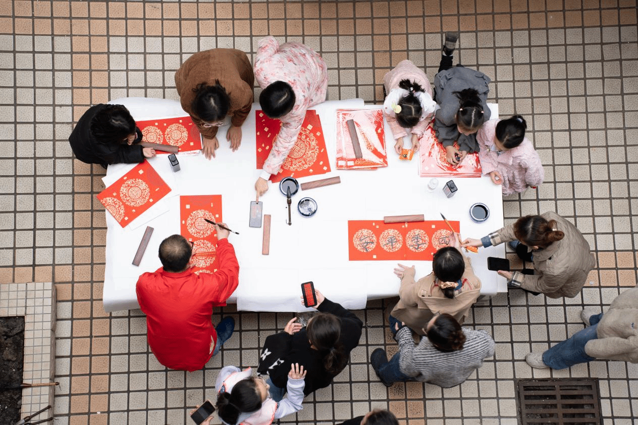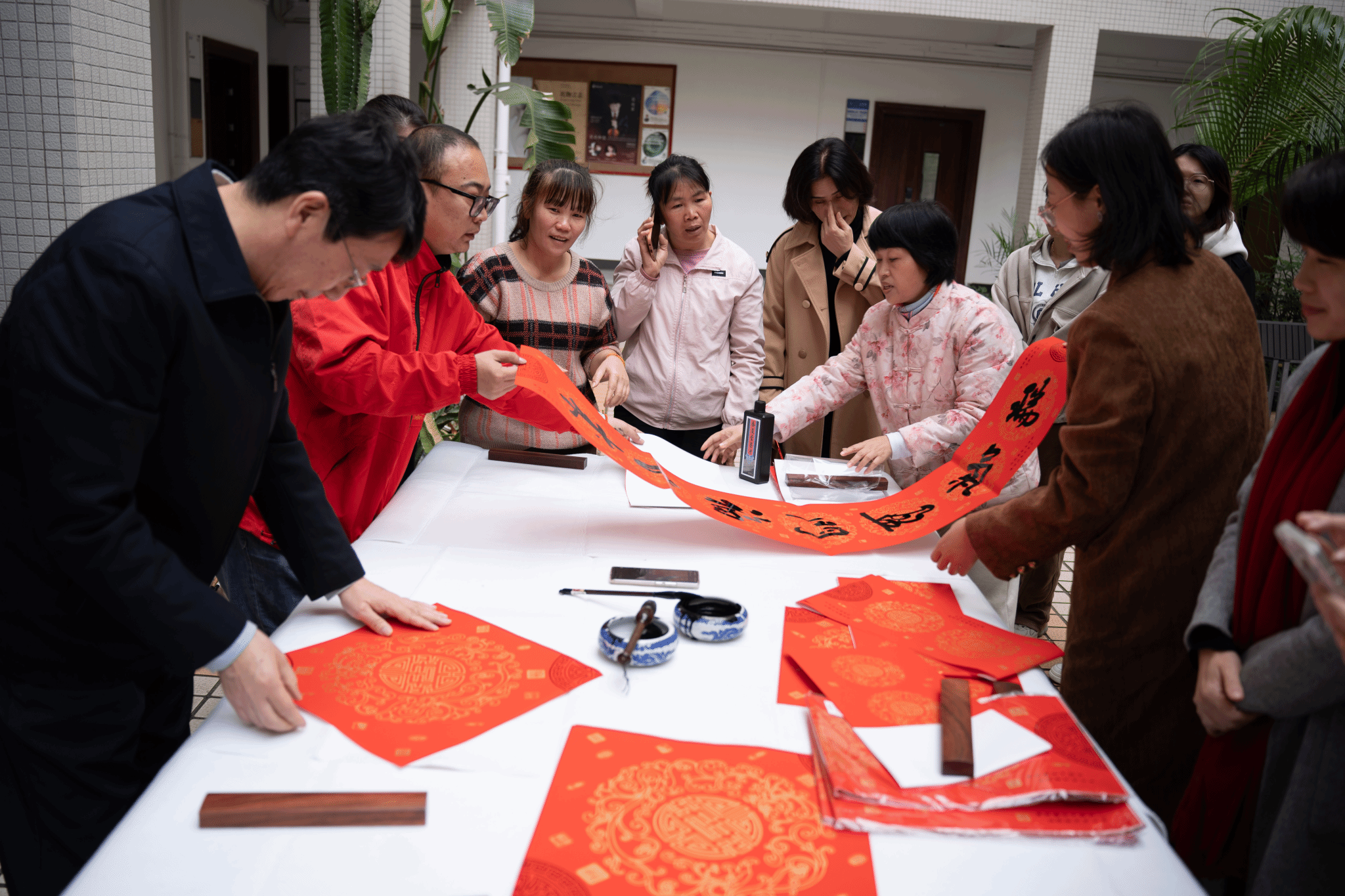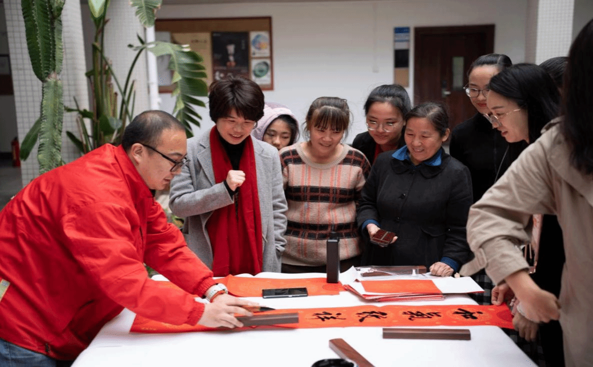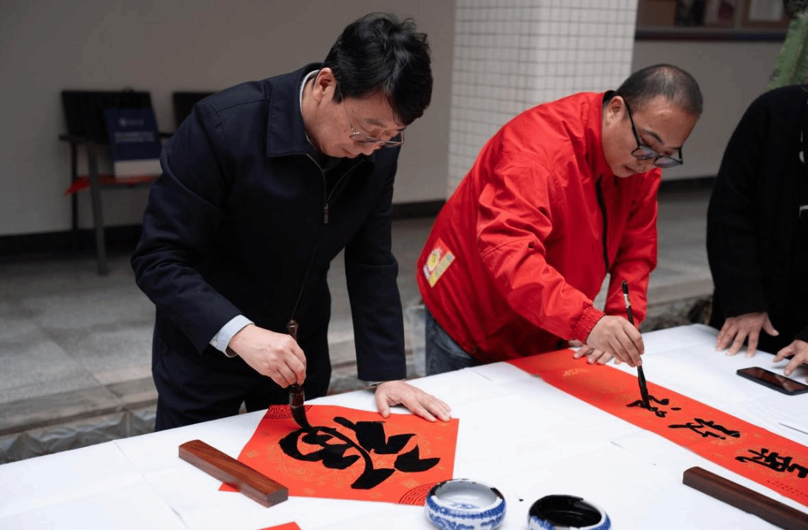 活动伊始,郑立波经理、何映敏书记分别致新春贺词,现场气氛热烈。接着,郑经理和魏鹏举老师为大家书写新春对联和“福”字,表达对全体师生的美好祝愿,大家围在书法台前,领取承载美好寓意的对联和“福”字,一同感受中华传统文化的魅力。